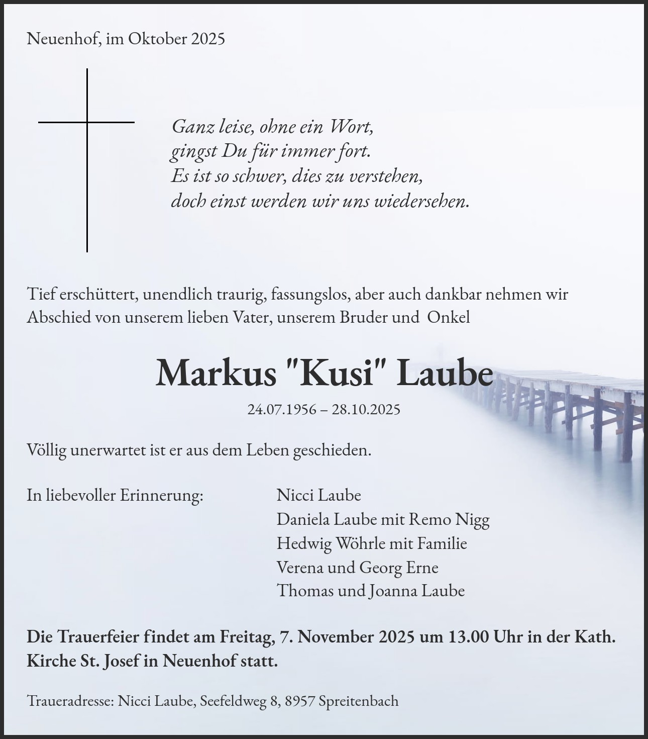 Traueradresse: Nicci Laube, Seefeldweg 8, 8957 Spreitenbach