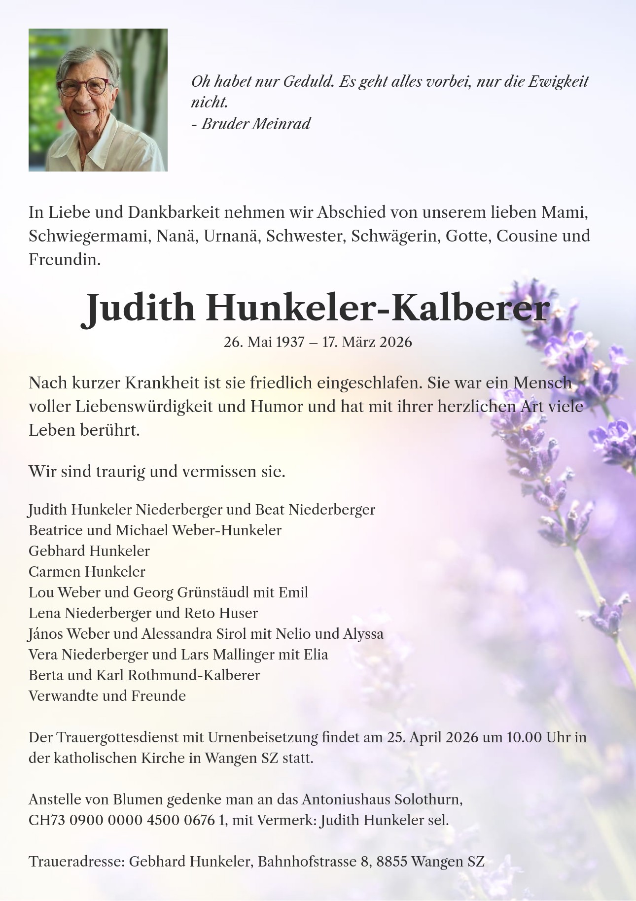 Judith Hunkeler Niederberger und Beat Niederberger Beatrice und Michael Weber-Hunkeler Gebhard Hunkeler Carmen Hunkeler Lou Weber und Georg Grünstäudl mit Emil Lena Niederberger und Reto Huser János Weber und Alessandra Sirol mit Nelio und Alyssa Vera Niederberger und Lars Mallinger mit Elia Berta und Karl Rothmund-Kalberer Verwandte und Freunde Der Trauergottesdienst mit Urnenbeisetzung findet am 25. April 2026 um 10.00 Uhr in der katholischen Kirche in Wangen SZ statt. Anstelle von Blumen gedenke man an das Antoniushaus Solothurn, CH73 0900 0000 4500 0676 1, mit Vermerk: Judith Hunkeler sel. Traueradresse: Gebhard Hunkeler, Bahnhofstrasse 8, 8855 Wangen SZ