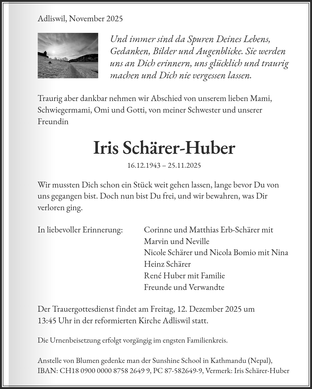 Die Urnenbeisetzung erfolgt vorgängig im engsten Familienkreis. Anstelle von Blumen gedenke man der Sunshine School in Kathmandu (Nepal), IBAN: CH18 0900 0000 8758 2649 9, PC 87-582649-9, Vermerk: Iris Schärer-Huber