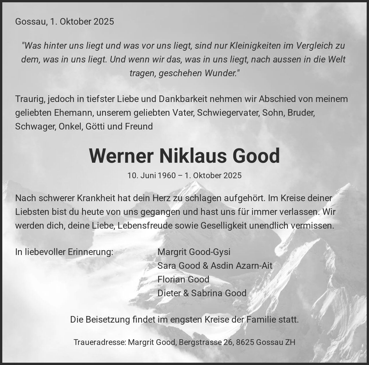 Traueradresse: Margrit Good, Bergstrasse 26, 8625 Gossau ZH
