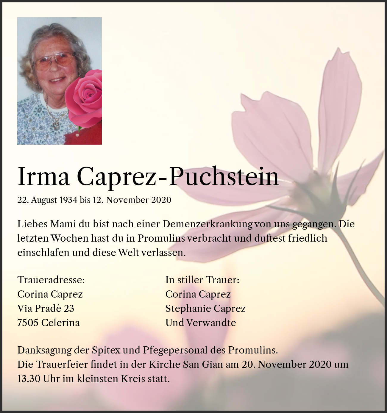 Danksagung der Spitex und Pfegepersonal des Promulins. Die Trauerfeier findet in der Kirche San Gian am 20. November 2020 um 13.30 Uhr im kleinsten Kreis statt.